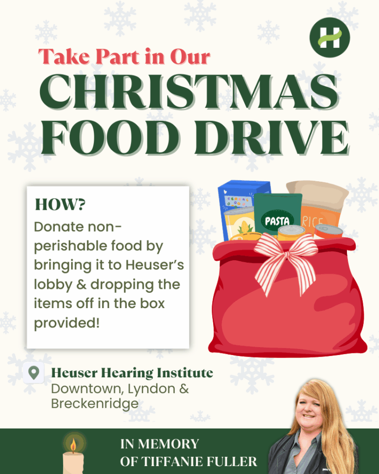 Holiday Food Drive Posted on November 7, 2025 by Heuser Hearing Institute When: November 7, 2025, 12:00pm - December 23, 2025, 5:00pm Event Details: Holiday Food Drive: Donate at one of our clinics
