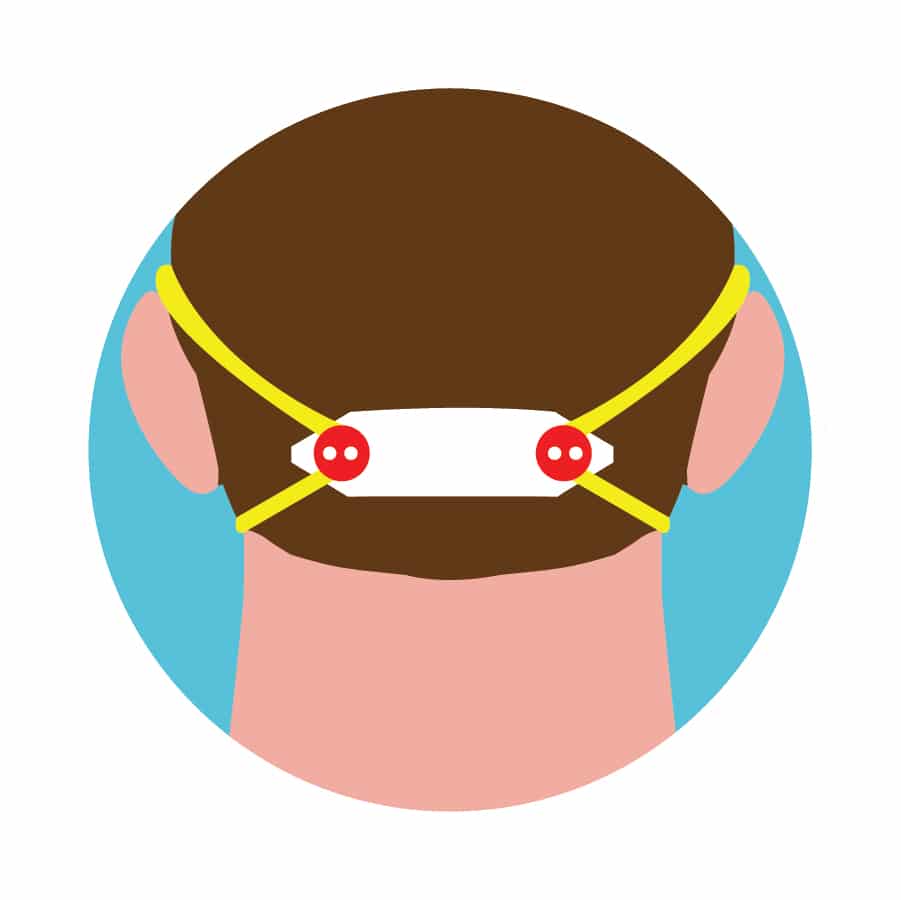 Sew two buttons onto a piece of ribbon to wear on the back of your head. Attach the mask’s elastic to the buttons.